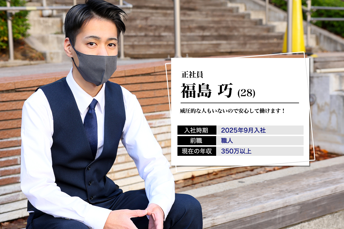 この業界に抱きがちな威圧的な雰囲気を持った人は一人もおらず、誰もがフラットに接してくれるため、心理的なストレスを感じることなく、未経験に近い状態からでも安心して業務に取り組むことができています。